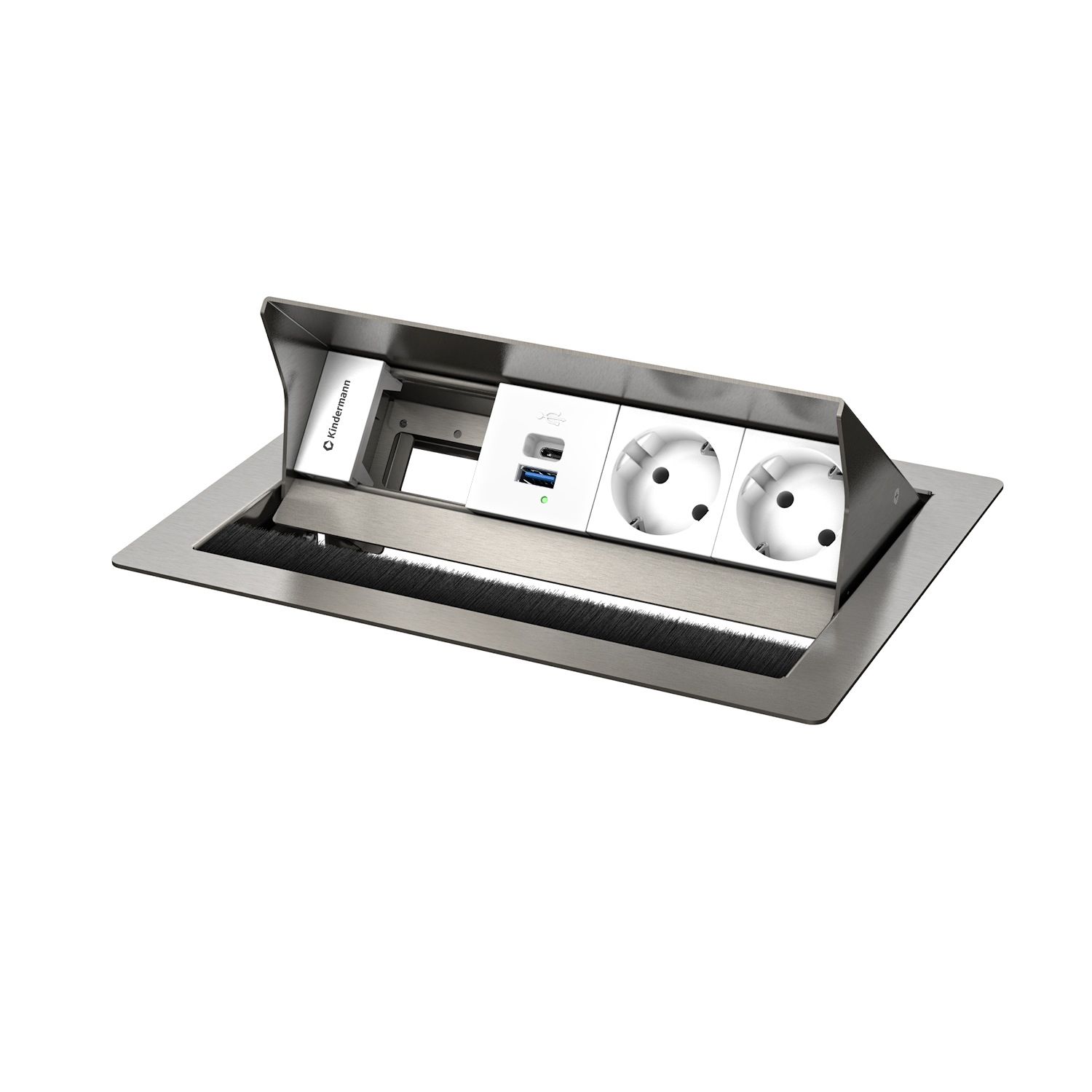 Asztali csatlakozó modul 4 betéthez, acél, előre szerelt 2 db hálózati aljzattal (Schuko) és egy dupla USB-töltővel beépített tápegységgel, valamint USB-A és USB-C csatlakozóval, amely legfeljebb 30 wattos töltési áramot támogat. Egyedileg felszerelhető Konnect flex 45 click előlapokkal.